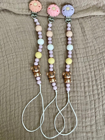 🌸🐻Keep pacifiers safe & within reach with our Bloom & Bear Pacifier Clips. Made with soft food grade silicone beads and an adorable teddy bear accent, each clip features a cheerful daisy clasp in pastel hues. Not only are they functional, but they add a sweet touch to any outfit.